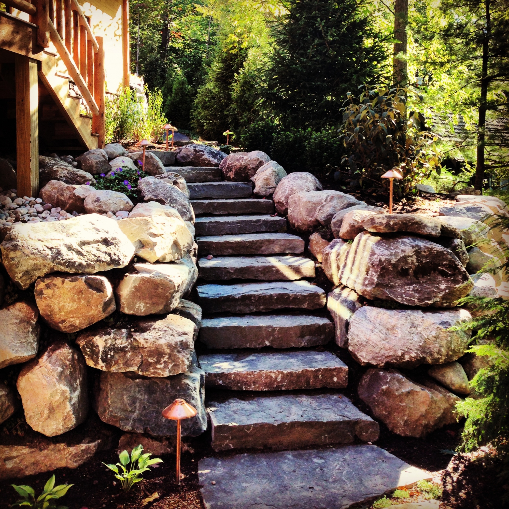 This yard was on a steep slope so we made a sunken fire ... from i.pinimg.com The perfect height for a fire pit, plus its a great place to sit your wine glasses. Just like everything else in your yard, a retaining wall or boulder wall needs to be maintained and cared for. Boulders are heavy, and some require equipment to move them. Starting at the corner, place the first two wall caps following the wall in the same direction. Build a unique outdoor fireplace using cool ideas! This area is filled with pebble rock fill. We are not an all around landscape company that does everything. This torch lake boulder retaining wall features a shannon limestone staircase.